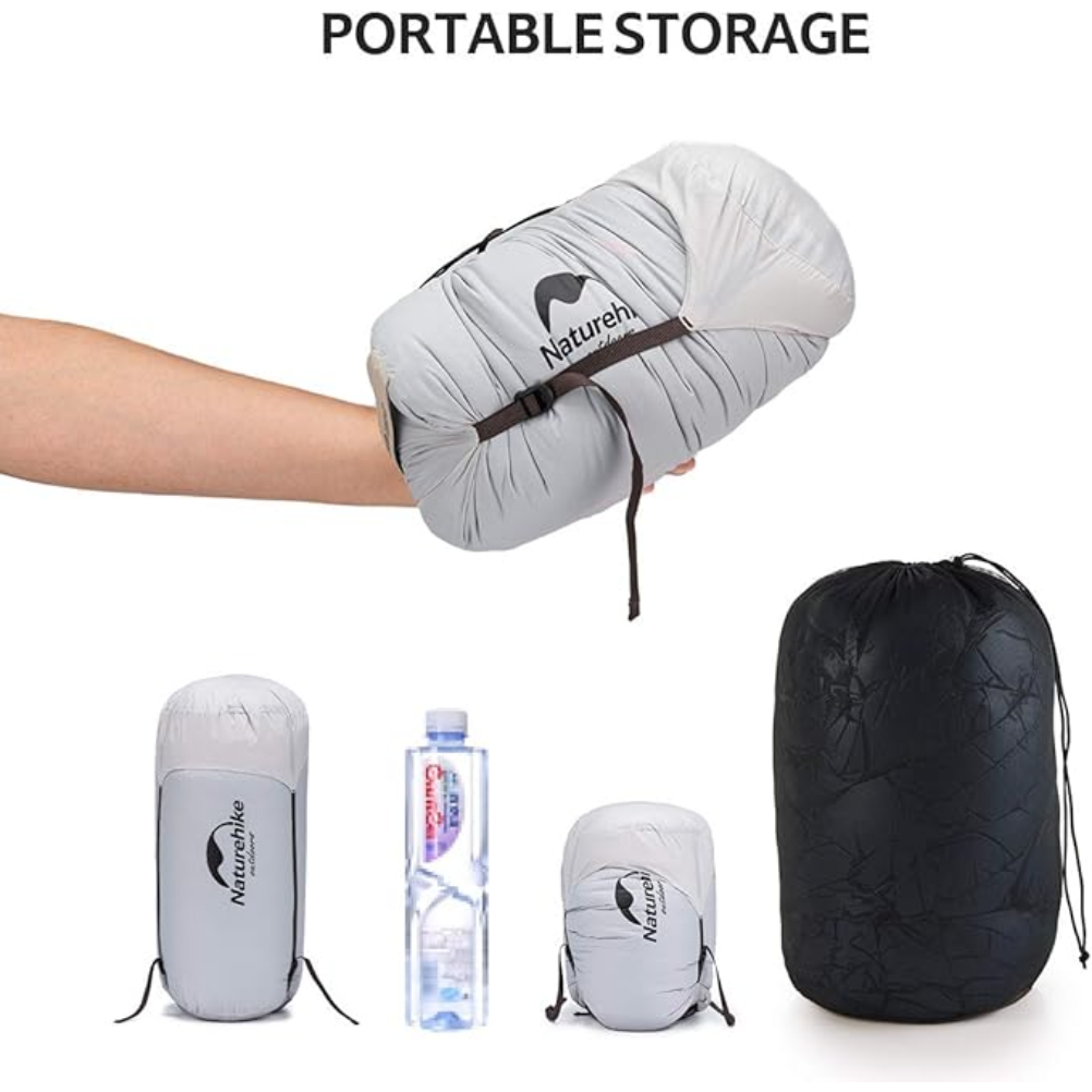 Naturehike Azul marino Saco de dormir cuenta con una construcción en forma de sarcófago, diseñada para permitir una mejor retención del calor. Fabricado en poliéster 210T y revestido con una capa de 250 g/m², este saco de dormir ofrece propiedades de aislamiento térmico. La cremallera lateral proporciona acceso y salida, mientras que la capucha ajustable mantiene la temperatura. Su peso es de aproximadamente 1,5 kg, lo que facilita su transporte. Tiene una longitud total de 220 cm y un ancho de 80 cm en la parte más amplia. El saco se pliega en un tamaño compacto, permitiendo un fácil almacenamiento. También incluye un saco de compresión para su transporte. Este modelo es adecuado para temperaturas mínimas de -5 °C, la temperatura óptima de confort es de 0 °C. Las costuras están selladas para evitar la entrada de frío y humedad.