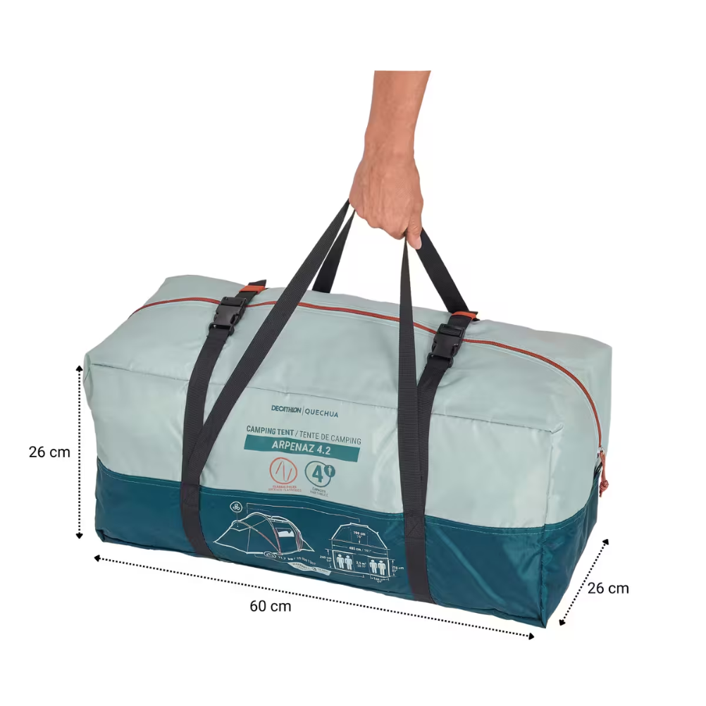La tienda de campaña Quechua Arpenaz 4.2 está diseñada para albergar hasta 4 personas. La estructura incluye postes de fibra de vidrio que garantizan estabilidad. La tienda cuenta con una doble tela que minimiza la entrada de agua. Posee una ventilación adecuada a través de mallas en las aberturas. Su instalación se realiza mediante un sistema de clips que facilita su montaje. Se presenta un vestíbulo con capacidad para equipaje y protección adicional. Las medidas de la tienda permiten un espacio interior amplio. Está fabricada con materiales que resisten condiciones meteorológicas variadas. La superficie del suelo es impermeable y se eleva algunos centímetros para evitar la humedad. Los elementos de la tienda incluyen estacas y cuerdas para su anclaje. Se puede almacenar en una bolsa compacta, facilitando su transporte. No incluye accesorios añadidos. Los detalles de cada componente están diseñados para cumplir con tiempos de uso prolongados en exteriores. La Arpenaz 4.2 es compatible con diferentes terrenos, lo que la hace versátil para diversas actividades al aire libre.